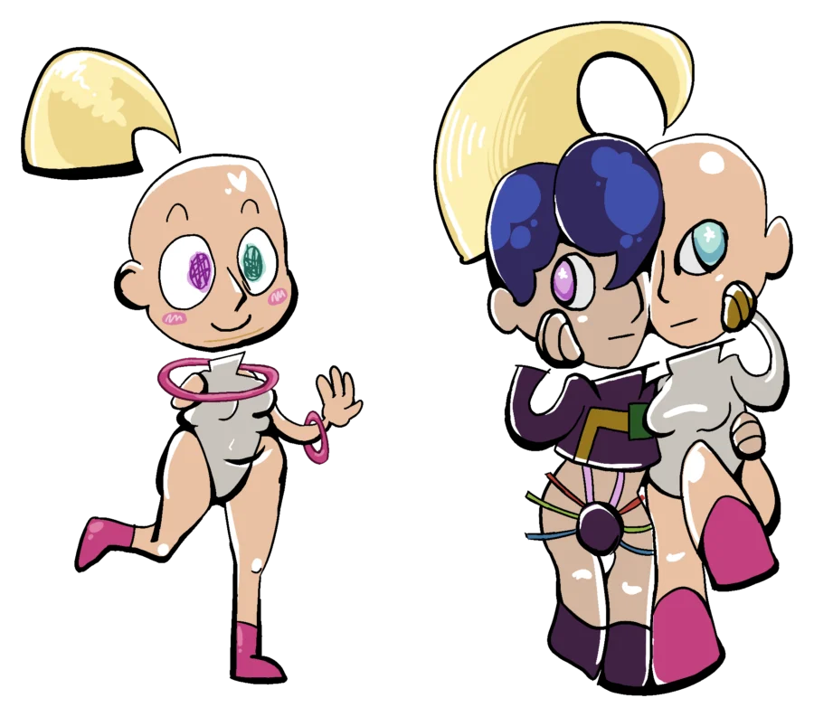 Herlock Sholmes wearing a pink crop top with a chibi gremlin Iris Wilson on his shoulder.