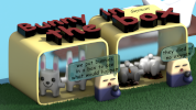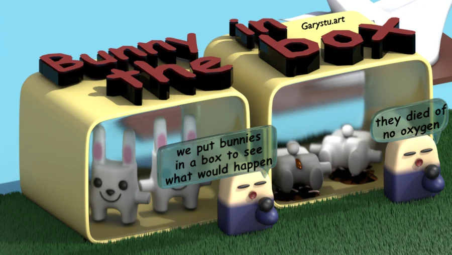 Visual description: Stylised 3D comic. Two bipedal, boxy cartoon rabbits are in yellow boxes and can be seen through large windows. A thumb shaped reporter is standing outside the boxes, reporting on the rabbits within.